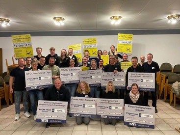Der 2023 vom Team gespendete Betrag wurde aus den Einnahmen der Veranstaltungen aus 2022 und 2023 generiert. Insgesamt gingen 7.500€ an folgende Empfänger: der KiGa Uni „Unter’m Regenbogen“ und das Familienzentrum St. Kunibertus „Arche Noah“ bekamen jeweils 250€. Jeweils 1.000€ gingen an das Kinderpalliativteam Siegen, den Malteser Herzenswunsch, das Kinder- und Jugendhospiz Balthasar, den Elterninitiative für krebskranke Kinder Siegen e.V., den Verein Frauen helfen Frauen, den Deutsche Kindehospizverein und das Josefshaus Olpe.
